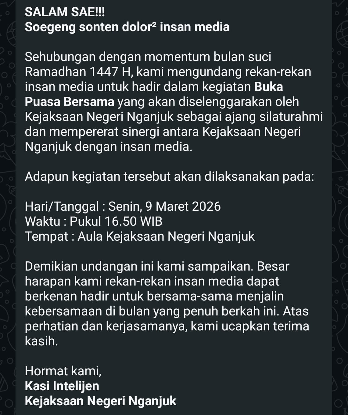 Sementara itu, hingga berita ini diturunkan, pihak Kejaksaan Negeri Nganjuk belum memberikan keterangan resmi terkait mekanisme undangan maupun alasan pembatasan peserta dalam kegiatan buka bersama tersebut.
