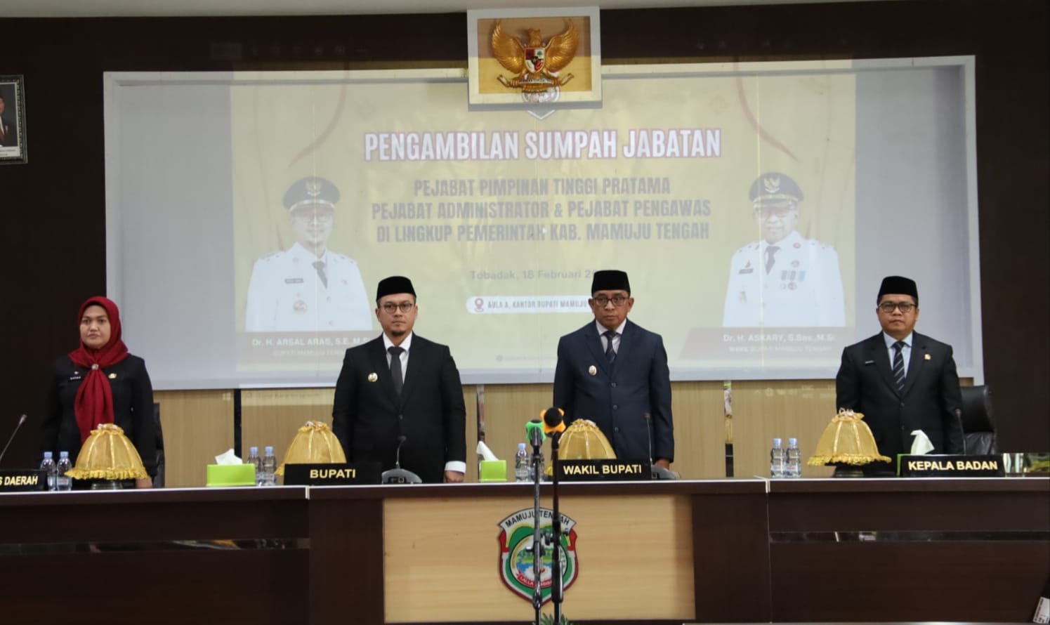 Mamuju Tengah,Pelopornews Rabu (18/2/2026) – Suasana resmi dan penuh harapan menghiasi Aula A Kantor Bupati Kabupaten Mamuju Tengah, Provinsi Sulawesi Barat, saat digelar pelantikan jabatan bagi para Pimpinan Tinggi Pratama, Administrator, dan Pengawas di lingkup Pemkab setempat. Prosesi pengangkatan dan pengambilan sumpah ini menjadi momen penting untuk mengesahkan amanah baru yang sah sesuai aturan perundang-undangan.