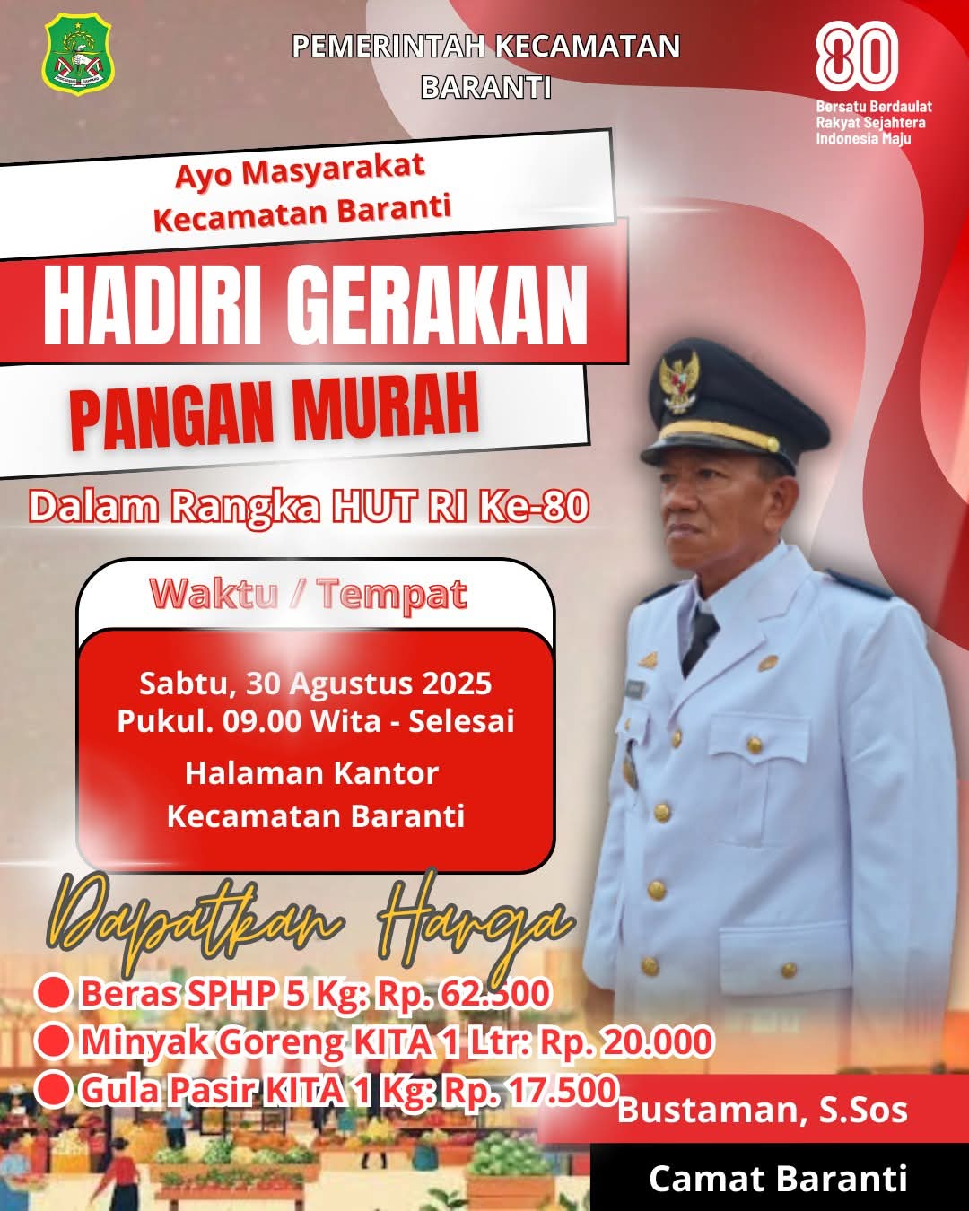 Camat Baranti, Bustaman, S.Sos, mengajak seluruh masyarakat untuk berpartisipasi dalam kegiatan ini. “Kami berharap dengan adanya Gerakan Pangan Murah ini, masyarakat dapat terbantu dalam memenuhi kebutuhan pokok sehari-hari, terutama menjelang perayaan HUT RI ke-80,” ujarnya.