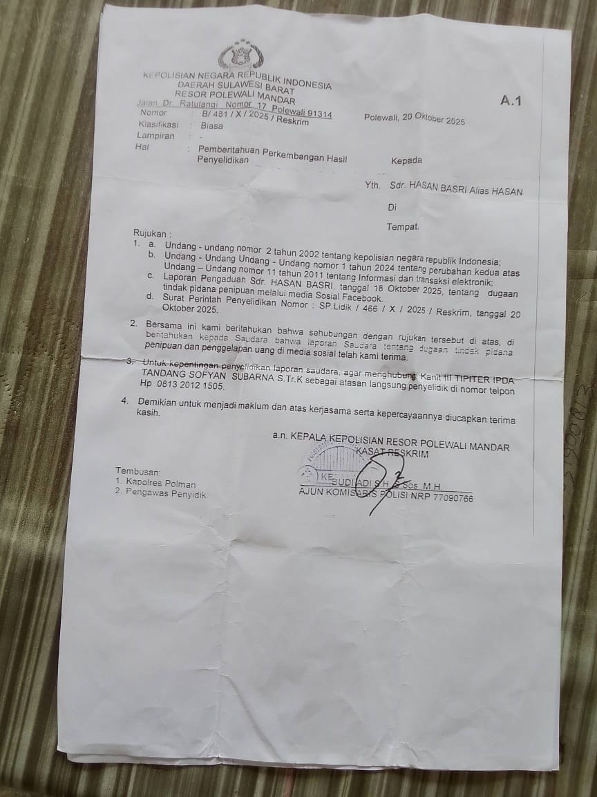 Polman, Pelopornews – Seorang pelapor di Kabupaten Polewali Mandar (Polman), Hasan Basri, menilai penanganan kasus dugaan penipuan dan penggelapan yang menimpanya oleh Polres Polman berjalan sangat lambat. Pasalnya, selama lebih dari empat bulan melapor, ia hanya menerima Surat Pemberitahuan Perkembangan Hasil Penyelidikan (SP2HP) satu kali.